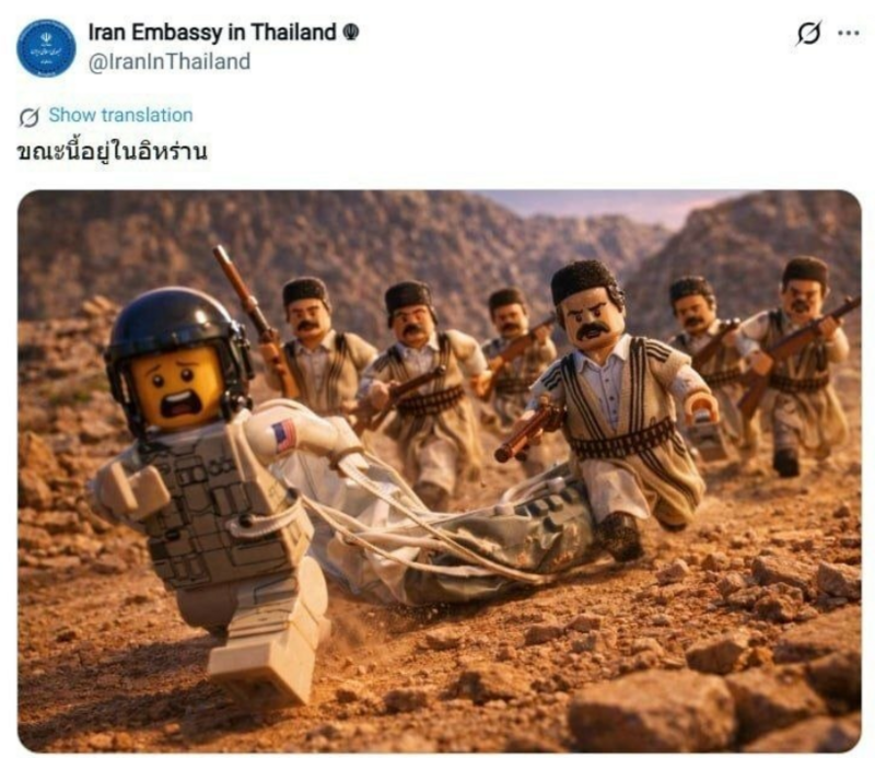 وعلقت سفارة إيران في تايلاند على خبر إسقاط المقاتلة الأمريكية والمصير المجهول للطيار بصورة ساخرة، ونشرتها على منصة "إكس".