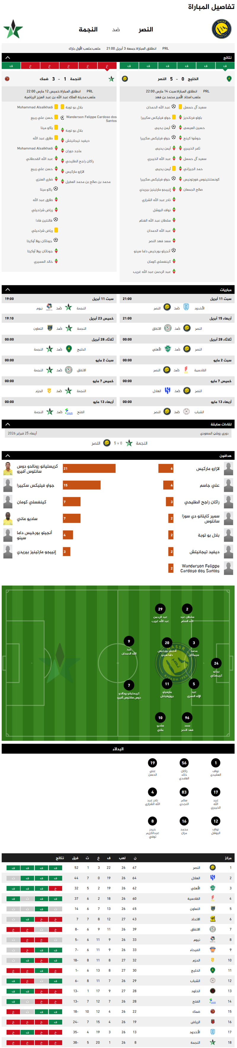 تغطية مباشرة لمباراة النصر ضد النجمة مساء اليوم الجمعة ضمن الجولة الـ27 من الدوري السعودي للمحترفين لكرة القدم.