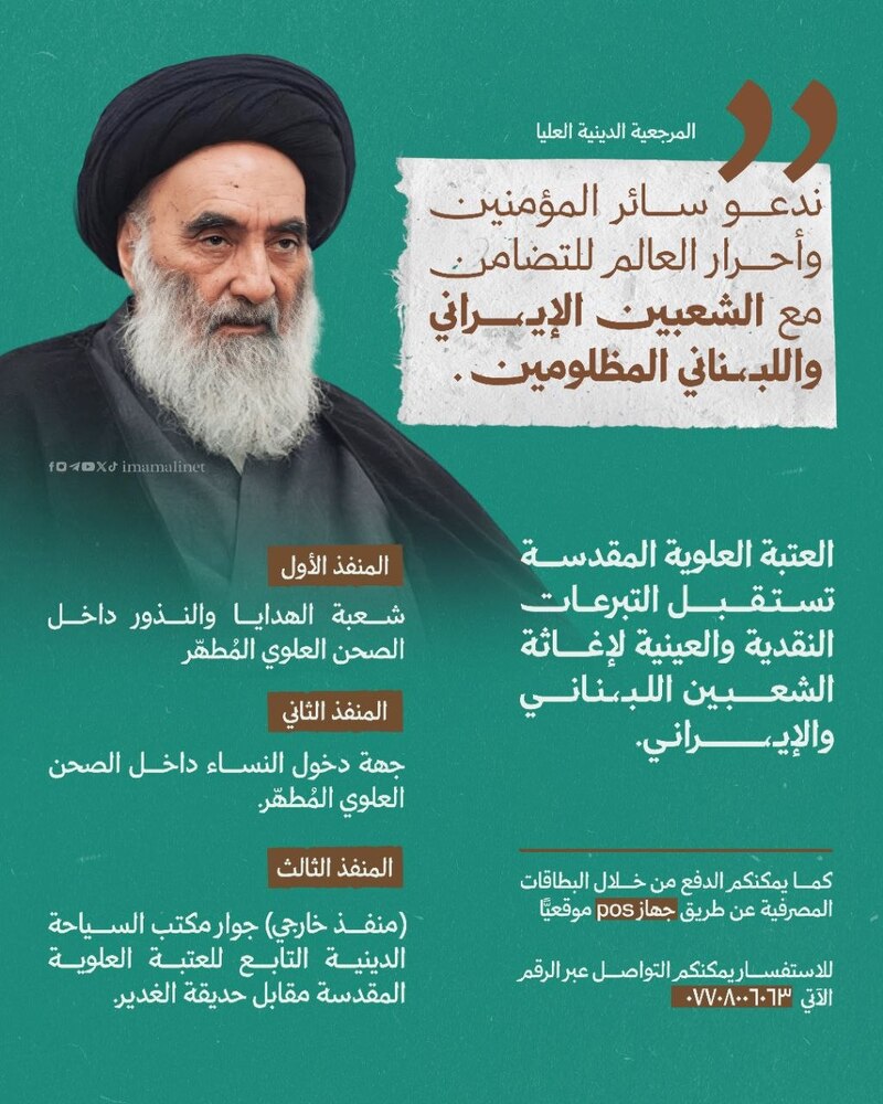 منافذ افتتحتها العتة العلوية المقدسة لاستقبال التبرعات للشعبين اللبناني والايراني