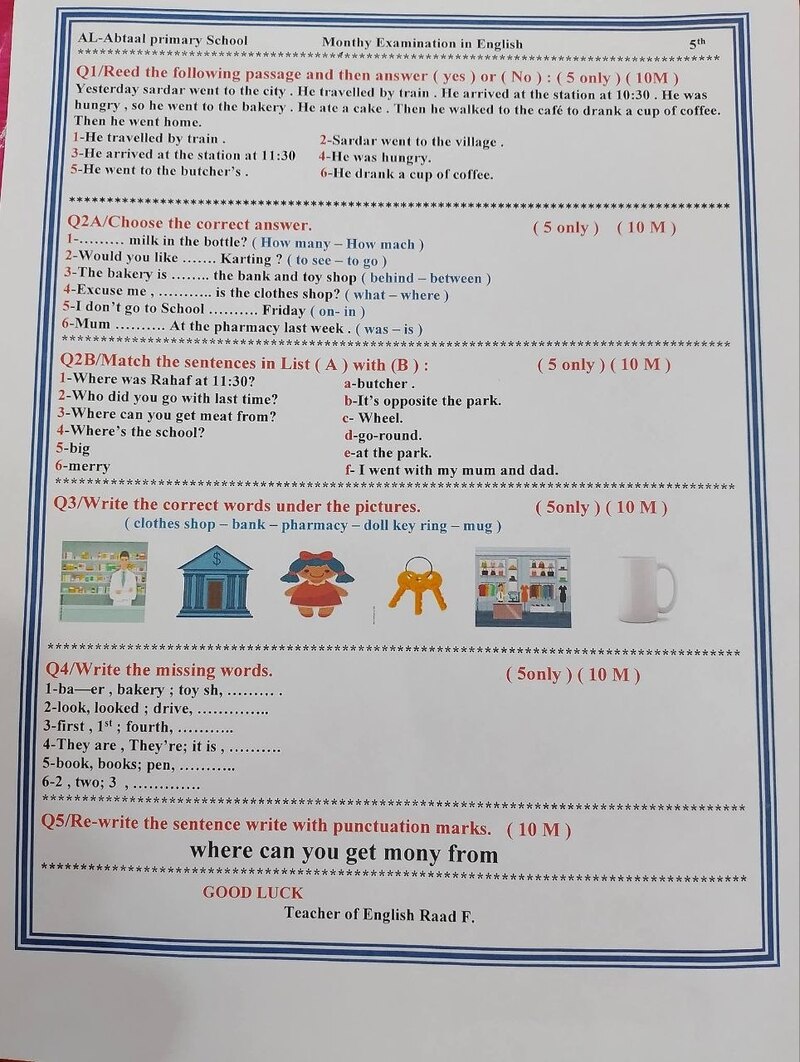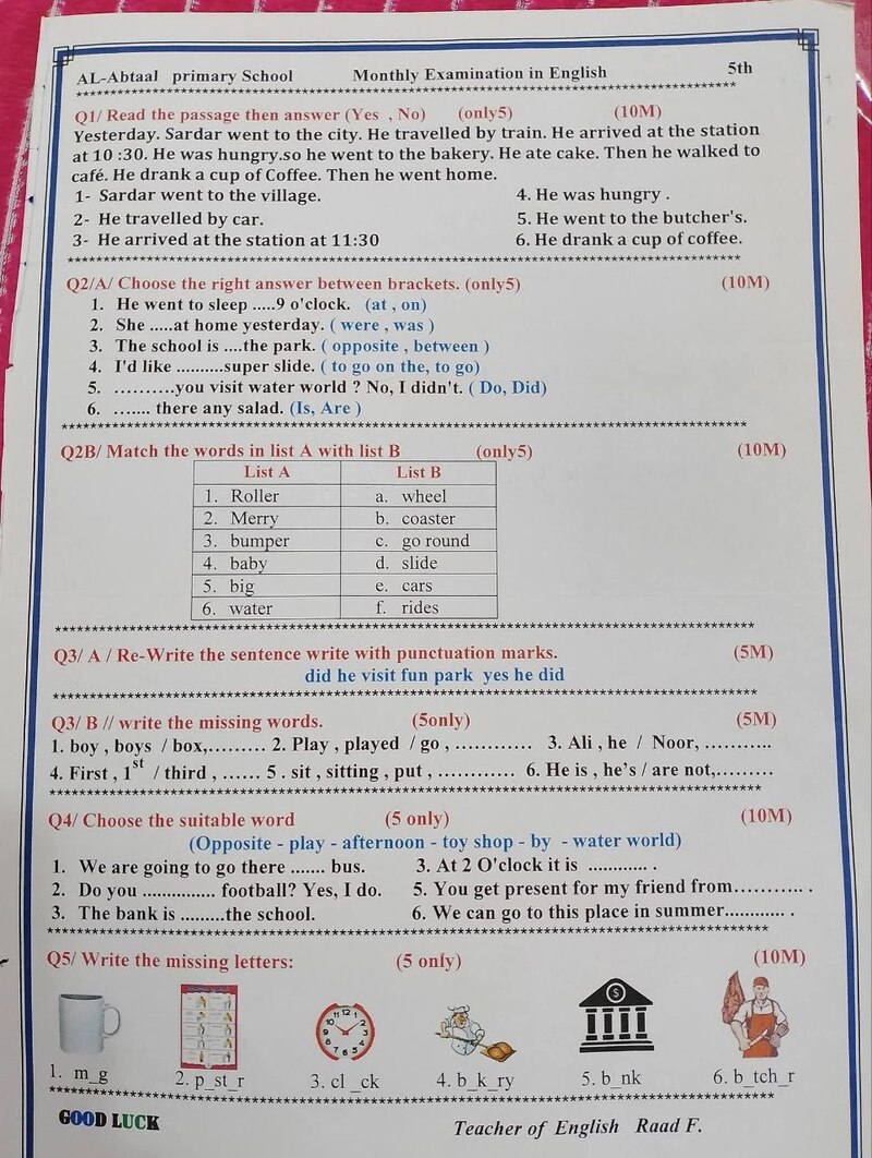 نماذج اسئلة انكليزي الوحدة السادسة 6 المنهج المنقح 2025-2026 الخامس الابتدائي
