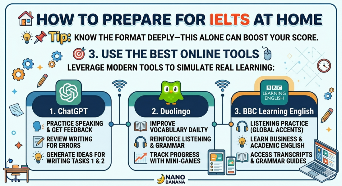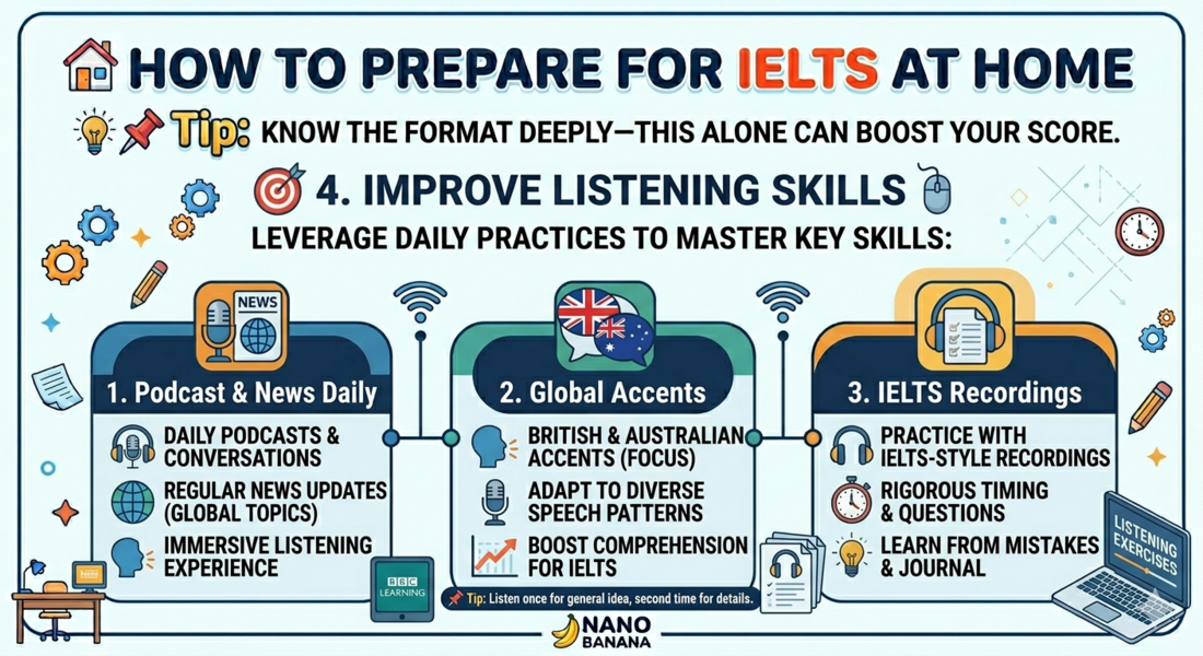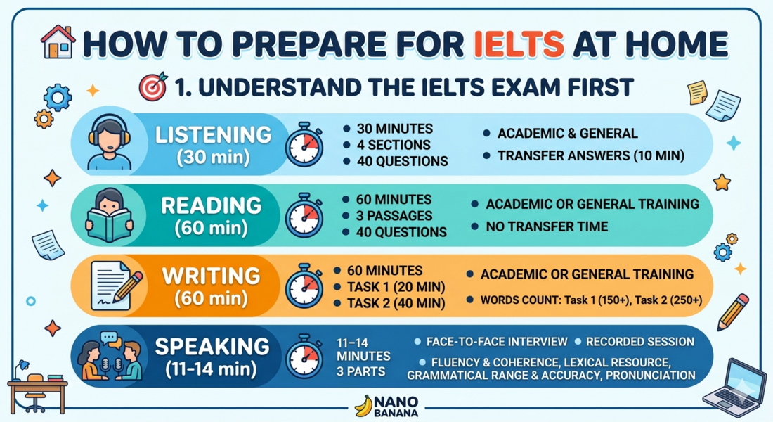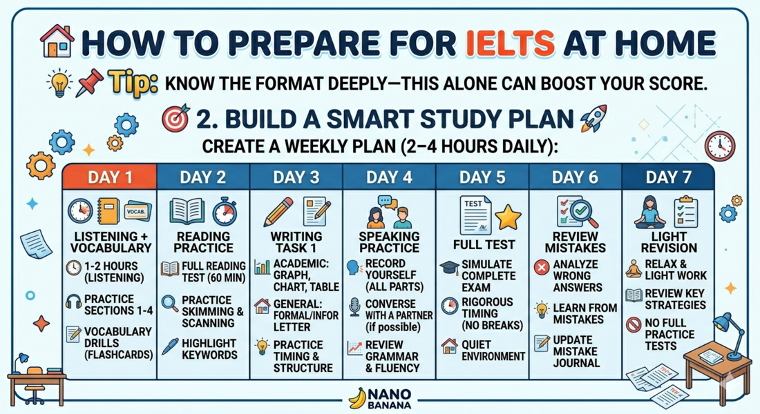 Here’s a practical, high-impact guide to help you prepare for the IELTS exam at home effectively—structured like a top scorer would approach it: