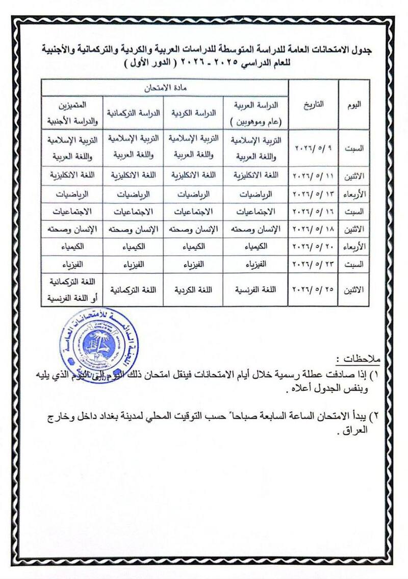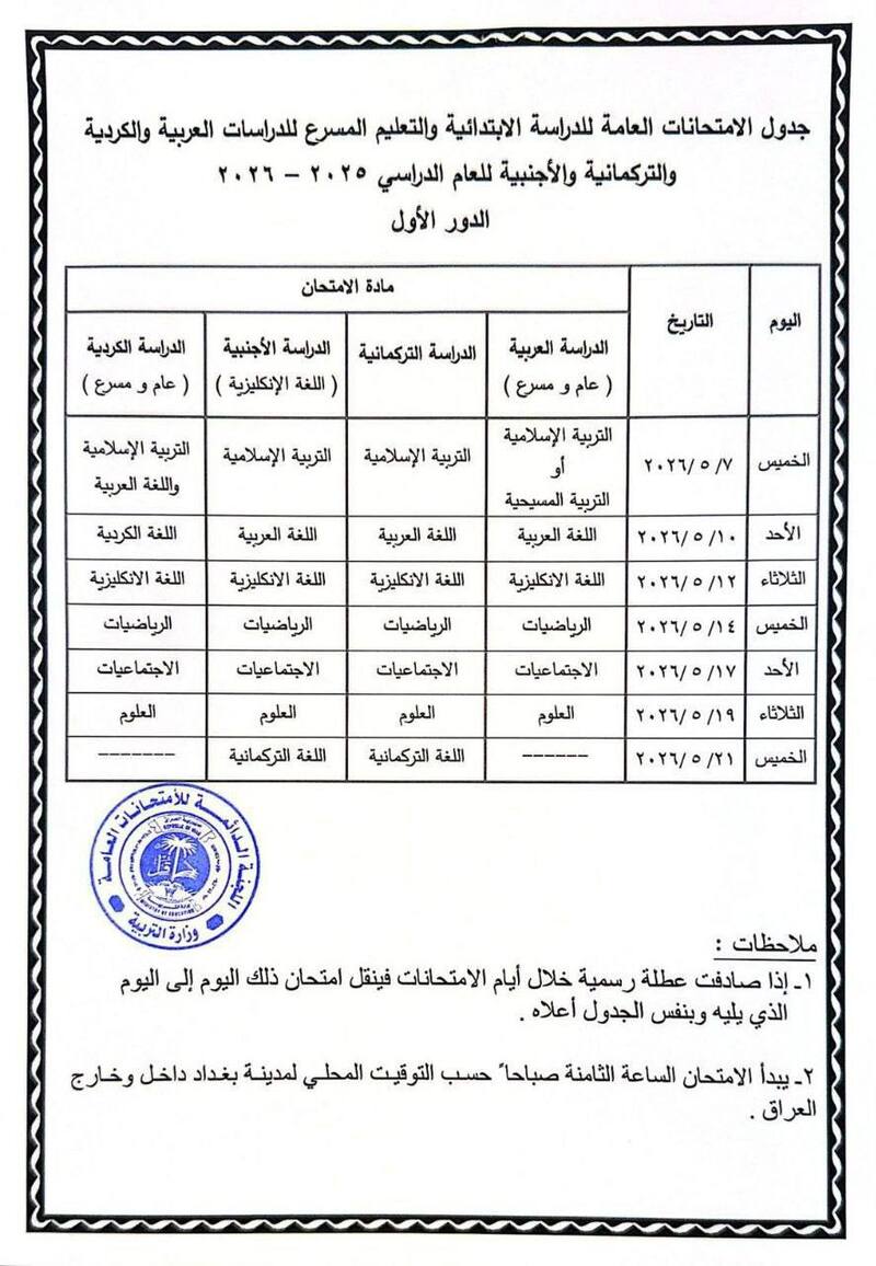 جدول السادس ابتدائي و الثالث متوسط بعد التعديل :
