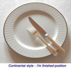 وعندما يتم الانتهاء من الطبق الرئيسي توضع الشوكة والسكين بجانب بعضهما على الطبق على شكل زاوية مائلة من أعلى اليسار حتى اليمين أسفل على أن تمتد مقابضهما خارج حدود الطبق قليلاً.