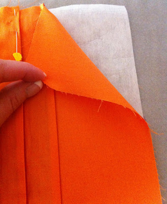 نقوم بترتيب القماش بحيث لون واحد فقط الذي يظهر لها ونثبته بالدبابيس ومن ثم برسم خط افقيا في منتصف القماش المجهز من قبل ومن ثم نقوم بالخياطة بالماكنة.
