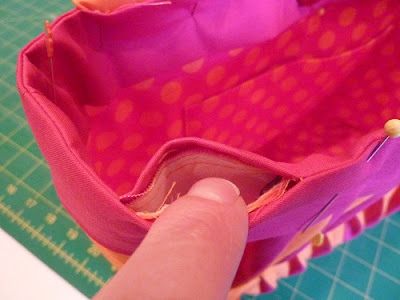 نخيط ايضا شريط قماش ونثبته على حافة الشنطة من الداخل ومن ثم نقوم بخياطتة.