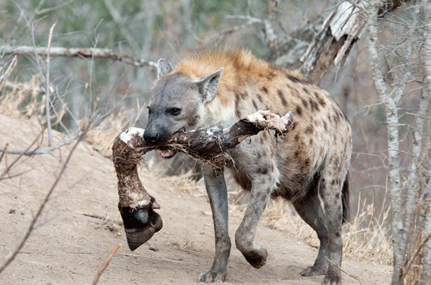 من المعروف ان الضباع تكون حذرة جدا اثناء التفاعل البشري نهارا ، الا انها تتحول عن ذلك ليلا حيث تصبح عدوانية وعرفت الضباع بمهاجمتها للبشر على مر القرون ويزيد ذلك السلوك اثناء الحروب وتفشي الامراض حيث تألف الضباع الجثث البشرية .