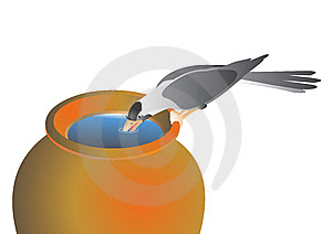 فكر الغراب بجد حتى خطرت له فكرة عندما رآى بعض الحصى. بدأ عندها بالتقاط تلك الحصى واحدة تلو الأخرى وأسقطها داخل الإناء. وعندما ملأ الإناء بالمزيد والمزيد من الحصى، ظل منسوب المياه داخل الإناء يرتفع إلى أعلى. بعد وضع ما يكفي من الحصى، أصبح باستطاعة الغراب أن يشرب من الماء الذي ارتفع منسوبه كفاية