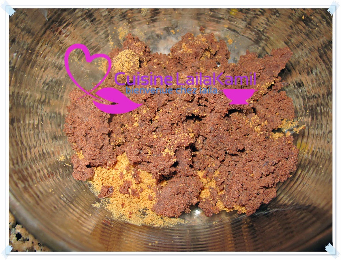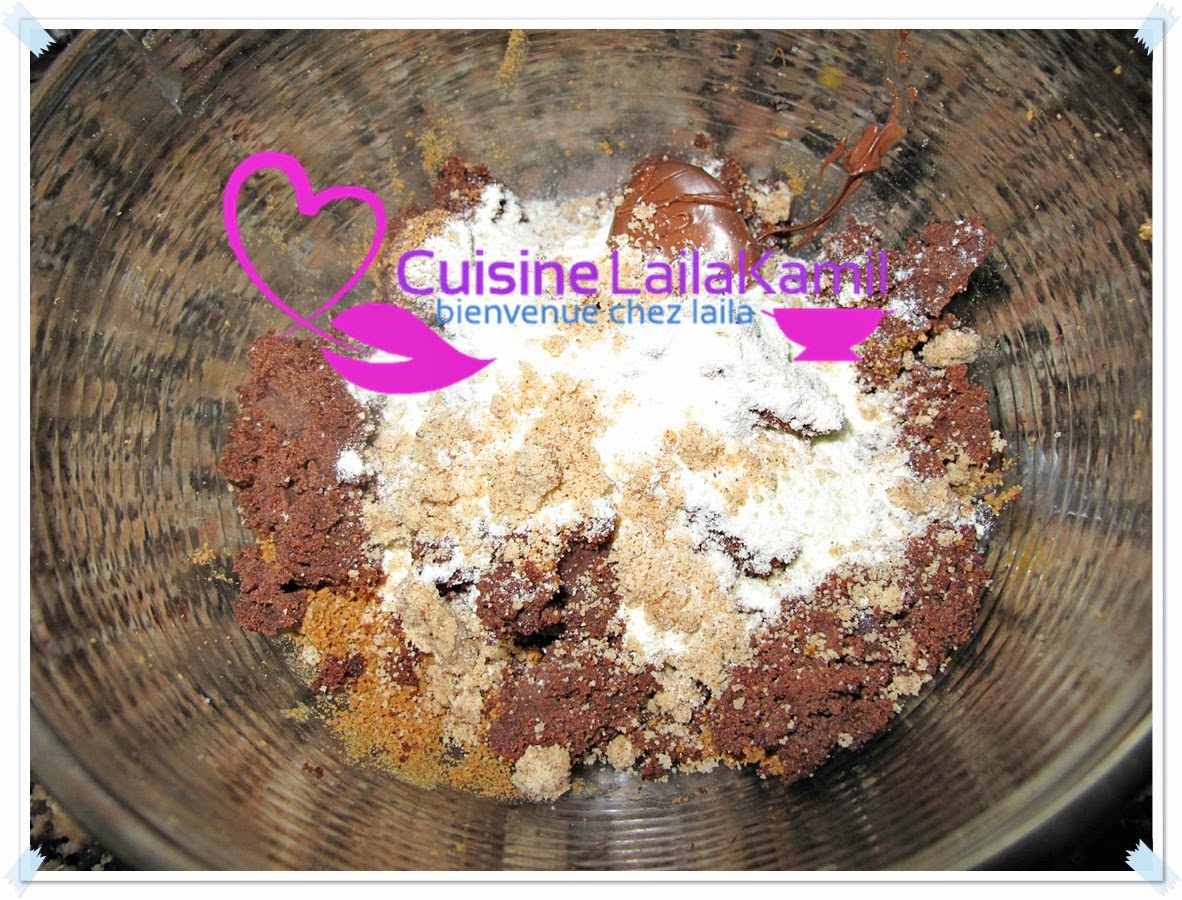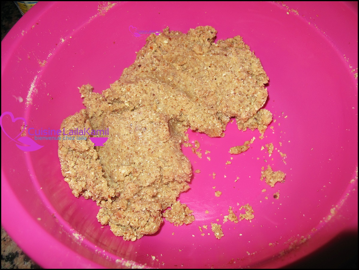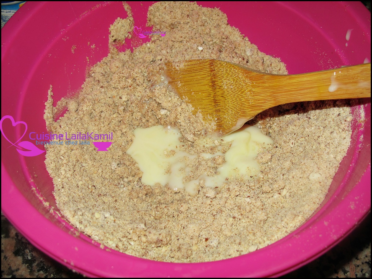 نفرم اللوز بقشره ونخلطه مع السكر والحليب نيدو والدقيق والزبدة وندخله الفرن ليتحمر حتى ياخد لون مائل للبني