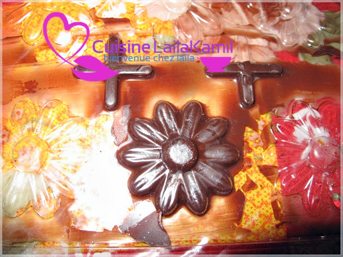 الشكل الثاني نضع قطع من اللوز فيا لجوانب ونضع وسطه القالب الشوكولا على كشل وردة