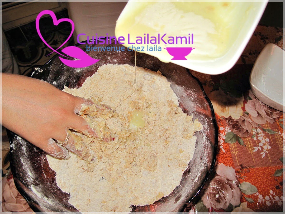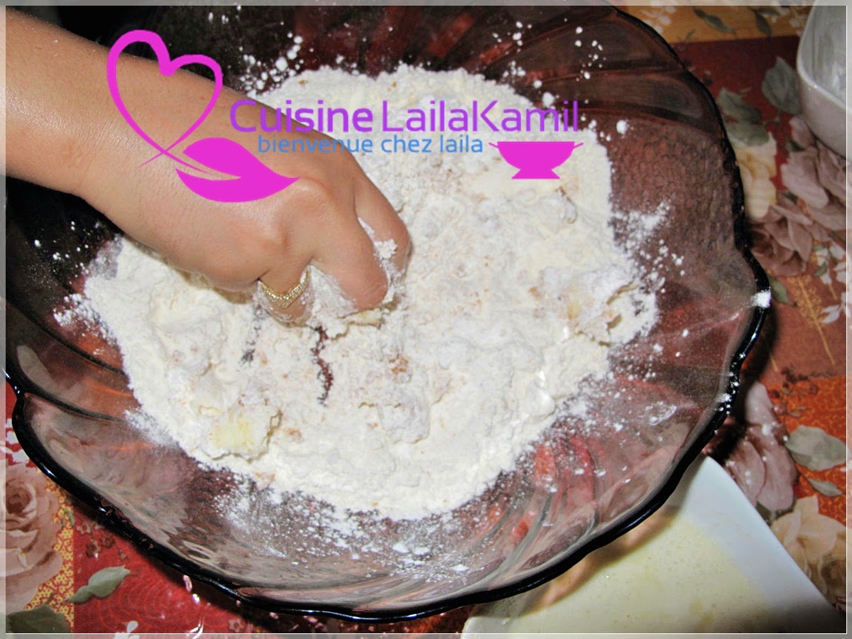 نجمع الدقيق مع الزبدة والسكر واللوز والنشا ونخلط بالاصابع حتى تختفي الزبدة