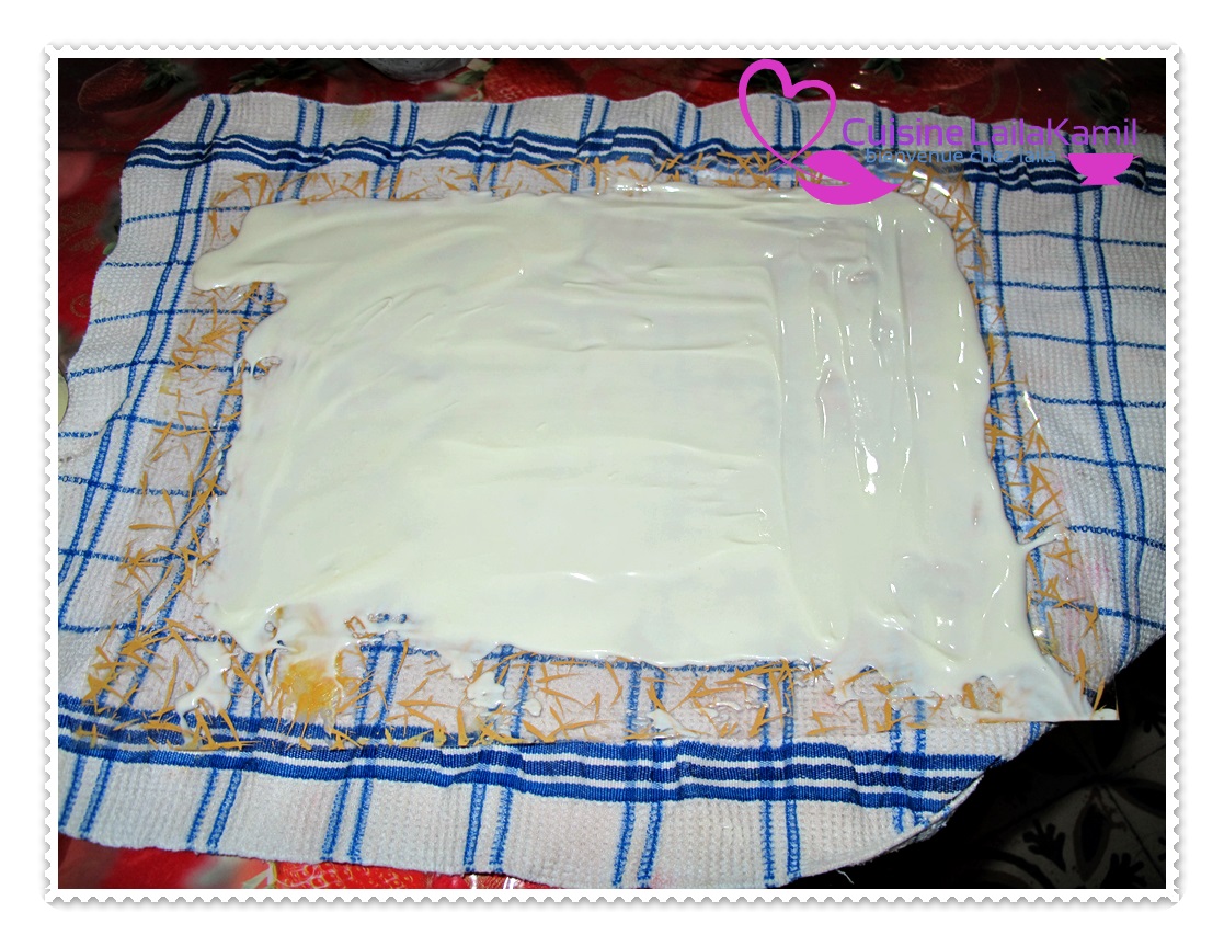نديب الشوكولا الابيض ونمدده فوق ورق الشوكولا