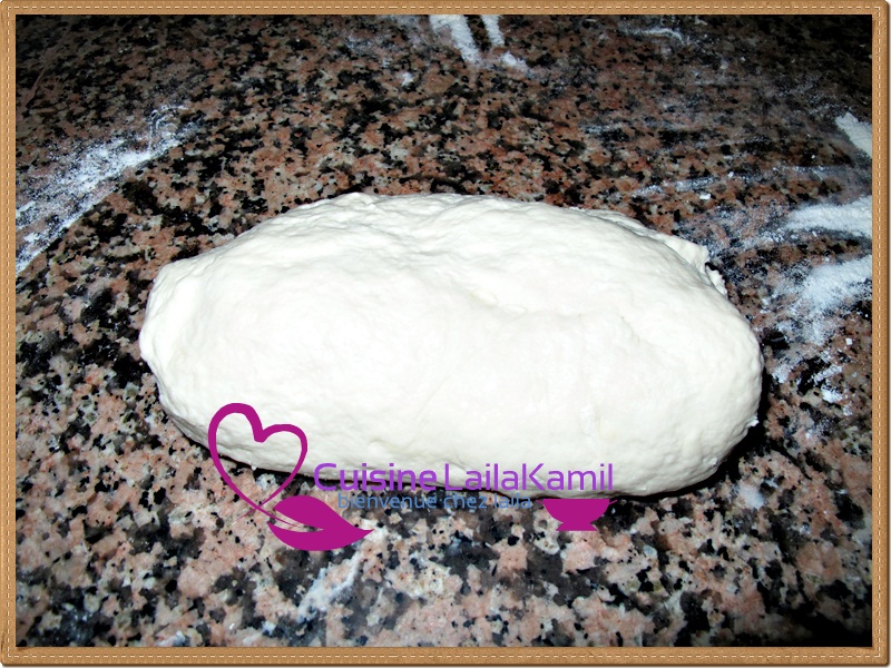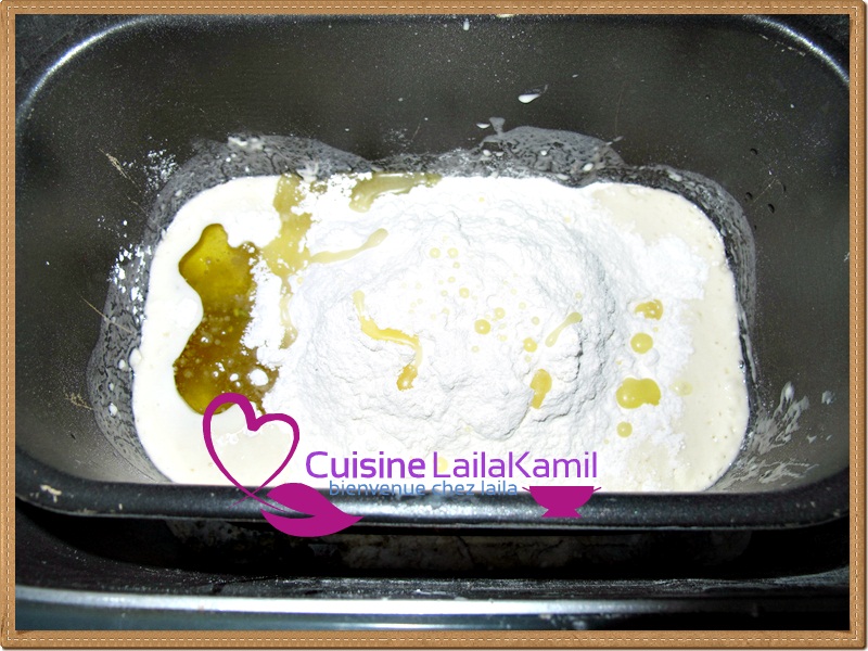 نضيف له ثلاث كؤوس دقيق ونصف كاس زيت نعيد الخلط والعجين جيداا