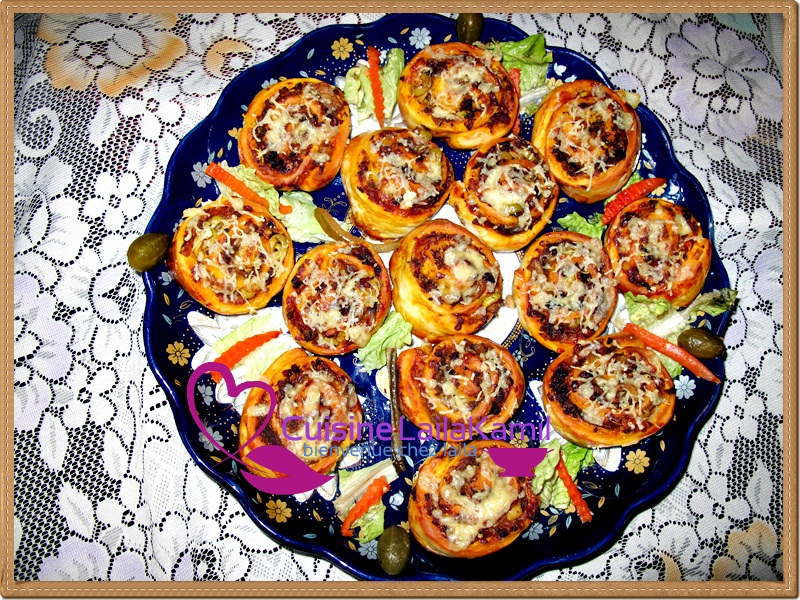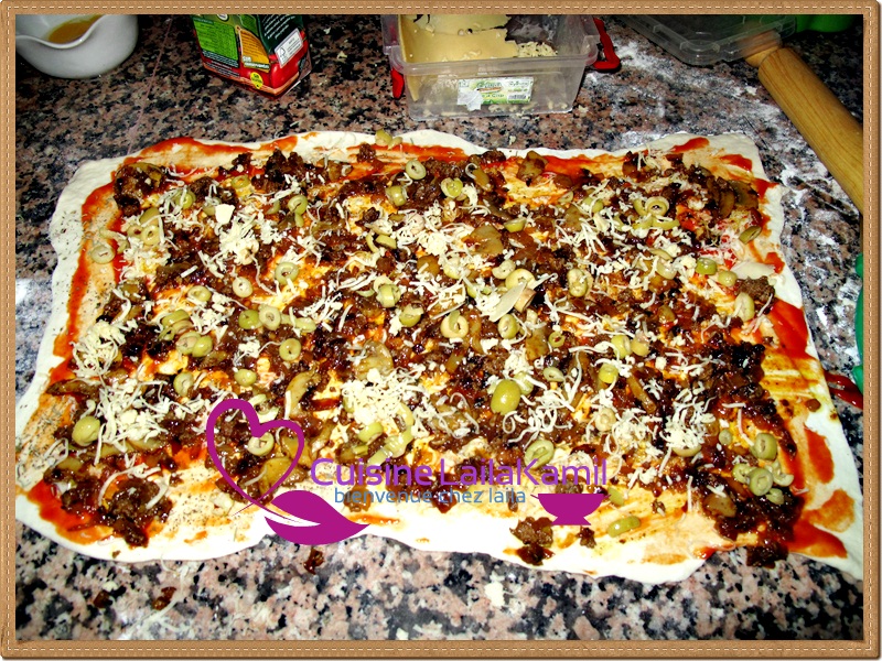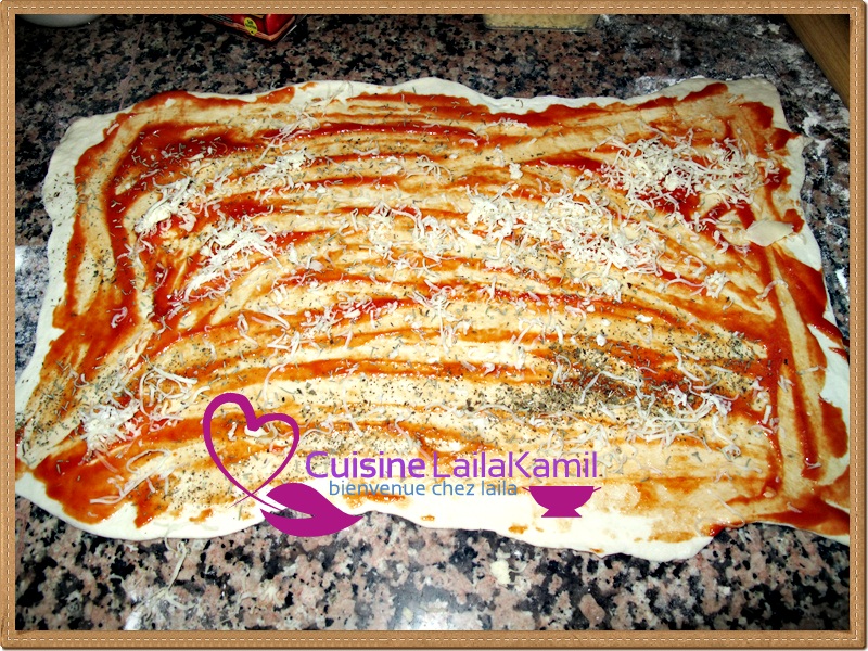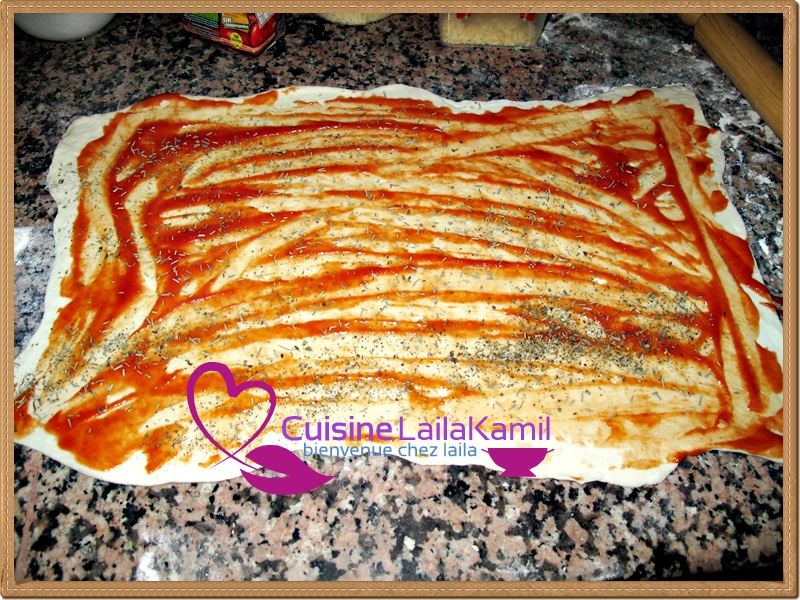 نمدد العجين كما في الصورة ندهنه بصلصة طماطم ونضيف له رشات من ازير والزعتر