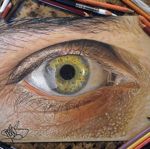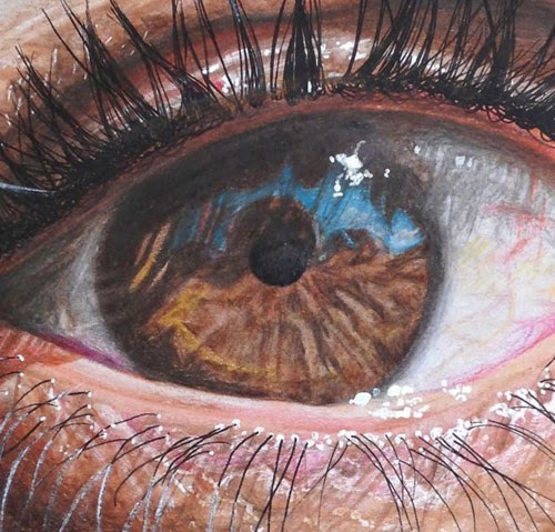 يقال أن " العيون هي نوافذ الروح " ربما إن نظرت للوهلة الأولى لهذه الصورة فإنك ستعتقد أنها صورة فتوغرافية لعين شخص ما ، ولكن هذا ليس صحيحا انها لوحة فنية قدر رسمت بأقلام الرصاص ولونت بطريقة فذة بالألوان الخشبية .