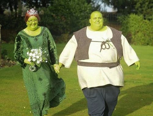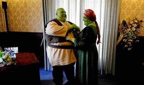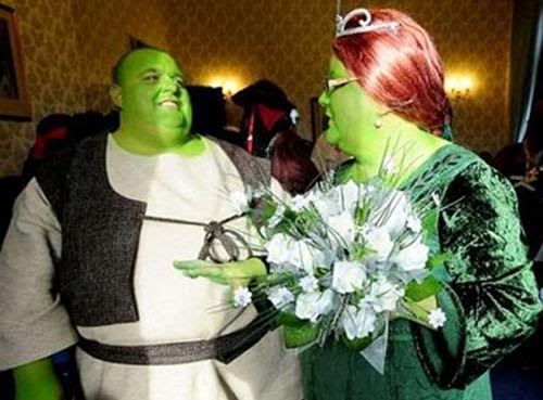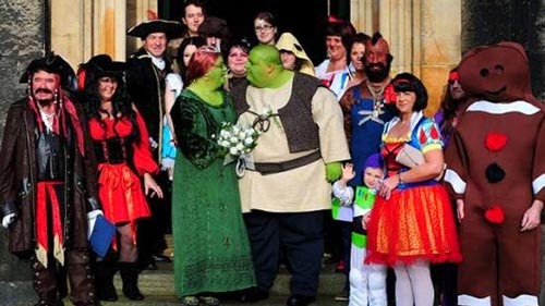 قرر ثنائي بريطاني أن يحتفلا بزواجهما بطريقة غير تقليدية، فكان فيلم الرسوم المتحركة “شريك” هو الخيار الأمثل، إذ ظهر العروسان في اليوم السعيد باللون الأخضر وطلبا من جميع الحضور التنكر بأزياء شخصيات الفيلم.
