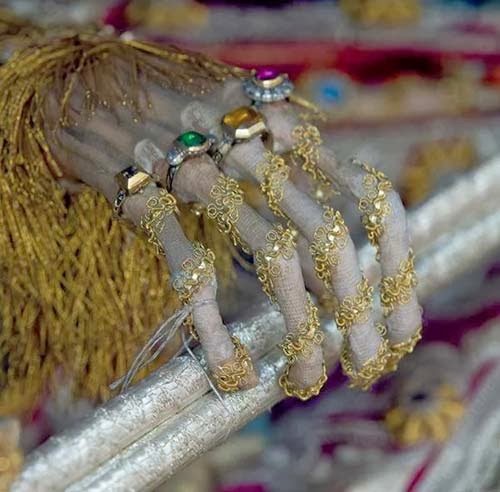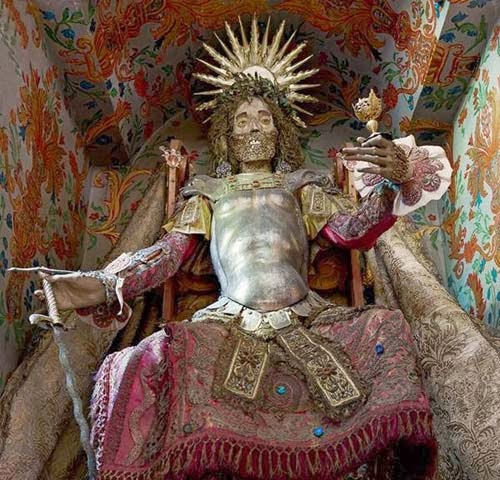 وعند وصولها إلى أماكنها تمت إعادة تجميع الهياكل العظمية بعناية ووضعت عليها الأزياء والشعر المستعار والمجوهرات والتيجان والدانتيل الذهبي والدروع لتذكير المؤمنين بالكنوز الفردوسية التي تنتظرهم في الآخرة!