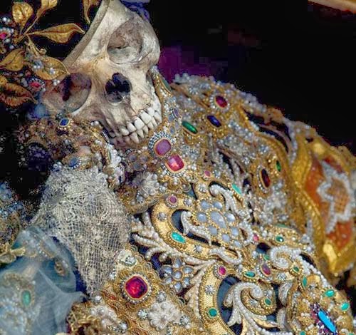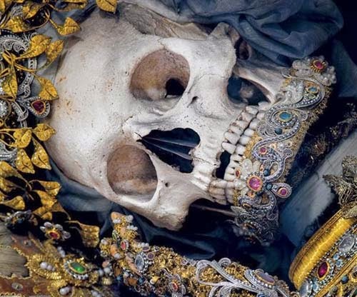 أعتقدت أن "الجماجم المزينة بالخرز" في المكسيك هو أمر مستغرب، إلى أن رأيت وفي أوروبا بالذات جماجماً وهياكل عظمية مزينة بالمجوهرات والذهب والأحجار الكريمة معروضة في بعض الكنائس.