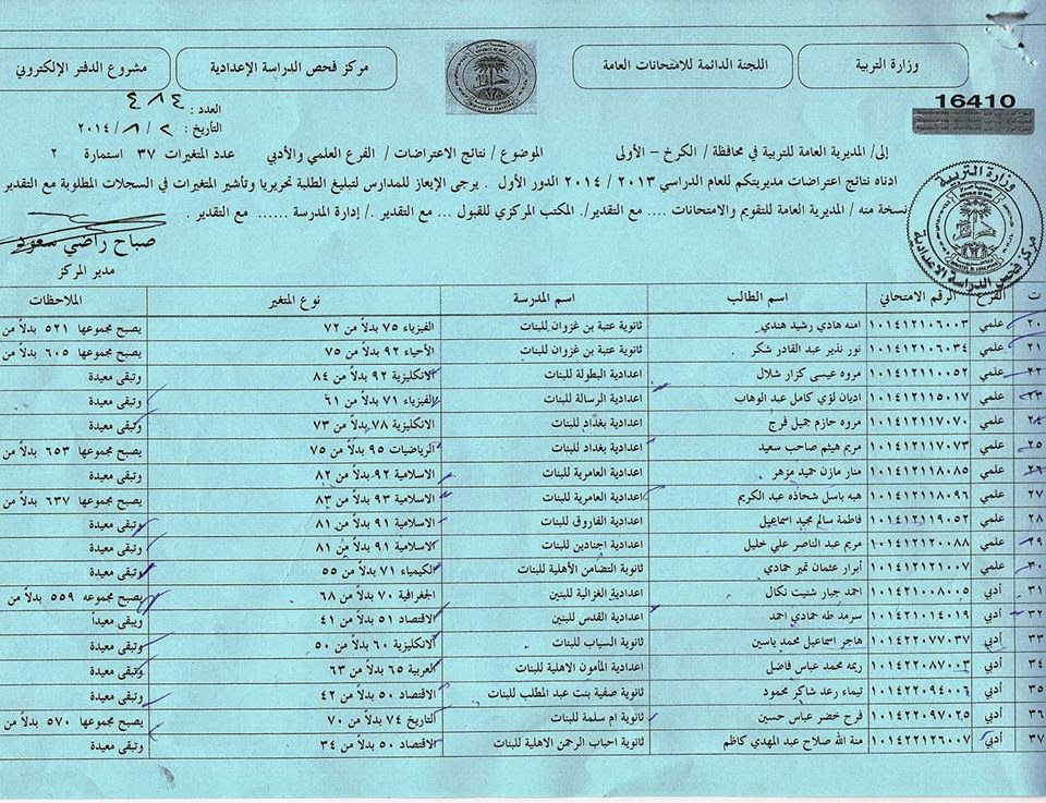 نتائج اعتراضات مديرية التربية في الكرخ الاولى للسادس العلمي بفرعيه للعام الدراسي 2013-2014 الدور الاول