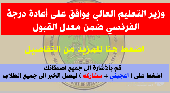 وافق معالي وزير التعليم العالي والبحث العلمي علي الأديب، على تأجيل العمل بقرار الغاء نسبة الـ(16%) من اللغة الاضافية والخاص باللغة الفرنسية الى العام الدراسي 2015/2014 .