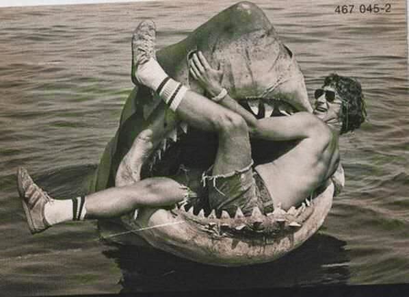 - المخرج العظيم ستيفين سبيلبيرج يجلس داخل فم سمكة القرش الميكانيكية في التي استخدمت بفلم جوس المشهور .