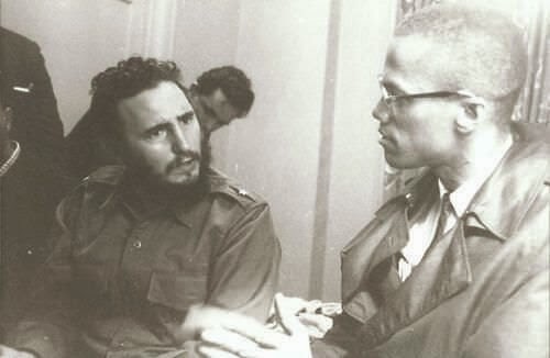 - الرئيس الكوبي فيدل كاسترو مع مالكولم اكس عام 1960, الذي اسلم وكون جماعة كادت تؤدي الى حرب اهلية بالولايات الامريكية وتكوين جمهورية اسلامية للسود .
