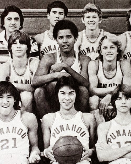 - الرئيس الامريكي باراك اوباما وهو بفريق كرة السلة بمدرسته الثانوية .