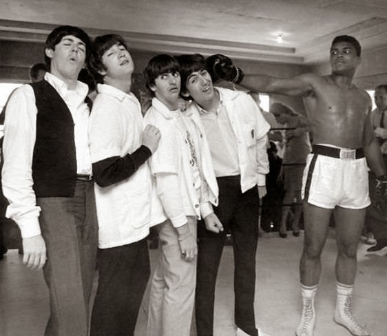 - مجمد علي كلاي مع فريق البيتلز عام 1964.