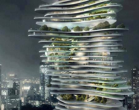 بكين العاصمة الصينية ستضم ناطحة سحاب فريدة من نوعها من تصميم الشركة الصينية الشهيرة MAD ، كل طابق سيكون مزاحاً عن الطابقين اعلاه و اسفله ليسمح بوجود فراغات اضافية ستتوضع فيها نباتات و شرفات تسمح بوجود فراغات خضراء معلقة و كانها غابة تنمو على البناء الذي سيبلغ ارتفاعه 385 متر،و سيكون بمثابة مجمع لتبادل الثقافة و الفنون في مدينة Chongqing الصينية،و هي محاولة جريئة من الشركة لتحقيق نوع جديد من التطوير العمراني في الصين الذي ياخذ بعين الاعتبار الاستدامة لحث المجمتع على التوجه نحو اسلوب حياة اقل تلويث للبيئة إذ لطاما كانت ناطحات السحاب رمز للقوة و الثروة و العلم في المدن الغربية فكانت فرصةللتاكيد على اهمية العمارة الخضراء و امكانية دمجها باسلوب عصري و حديث في الهندسة المعمارية، بعد ان تخلت في الصين لفترة طويلة عن اهتمامها بالطبيعة التي تواجدت في بيوتها التقليدية بسبب غلبة الطابع الغربي عليها.
