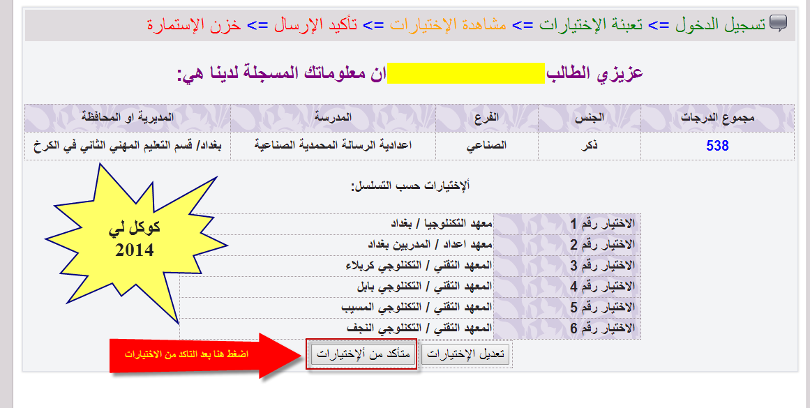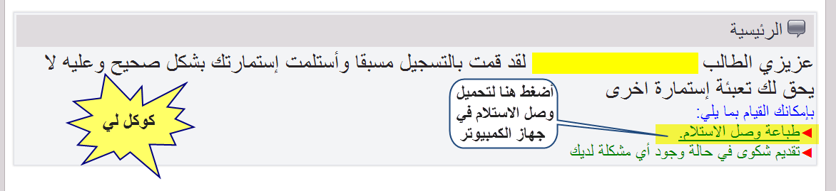 بعد ظهور ( تم خزن البيانات ) ثم بالضغط على زر ( الرئيسية ) وثم الدخول مرة اخرى من خلال الرقم الامتحاني والرمز السري ) لطباعة وصل الاستلام الخاص بك . والفائدة منه هو يبقى كدليل لضمان حقك في حالة حدوث اي مشكلة في قبولك مستقبلاً.