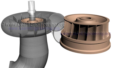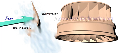 يمكنك أيضا ملاحظة شيء غريب حول الشفرة. ذلك هو وجود نوع من شكل دلو نحو المأخذ. لذلك سوف تصل المياه، وتنتج قوة اندفاع قبل مغادرة runner. وكلاً من قوة الاندفاع وقوة الرفع ستجعل runner يدوير.