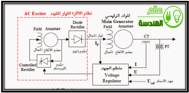 2-أنظمة الإثاره (AC)يتكون هذا النظام من مولد تيار متردد وقنطرة مقوم ثايرستور متصله مباشرتاً بعمود مولد تيار متردد بهذا يتم الإستغناء عن عضو التوحيد وحلقات مجمع مجال مولد الرئيسي وبعض التوصيلات الآخرى .