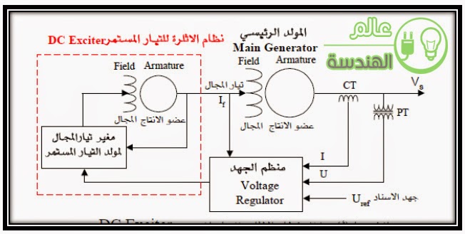 1- نظام الاثاره (DC)يتكون هذا النظام من مولدات تيار مستمر لإمداد تيار المجال للآله المتزامنه.ولهذا النظام مستثير رئيسي ومستثير دليلي :اولاً ـ المستثير الرئيسيه :هو مولد تيار مستمر منفصل الإثاره ويعطي تيار المجال مولد التيار المتردد.ثانياً ـ المستثير الدليلي :هو مولد تيار مستمر ذو إثاره ذاتيه ويعطي تيار المجال للمستثير الرئيسي.ويمكن إدارة كل من المستثيرالرئيسي والدليلي عن طريق العمود الرئيسي (مباشر أو خلال تروس) أو يدار منفصلاً بواسطة محرك ، والمستثيرات المداره من العمود الرئيسي تقي نظام الوحده للتشغيل والإثاره من التأثر بالإضطرابات الخارجيه.ومن وجهة النظر تلك تفضل المستثيرات ذات الإداره المباشره.نجد أن مولدات الهيدرو تدور عند سرعات منخفضه ، ونادراً ما تنطبق سرعة الدوران مع السرعه الأكثر إقتصاداً لمقنن محدد المستثير . لذلك يستخدم حجم إطار كبير للمستثير ، وهذا الحجم بالرغم من تكاليفه الباهظه إلا إنه يبسط تهوية المستثير ويقدم منافذ كافيه لإجراء الصيانه وضبط الفرش وعضو التوحيد .مستثير مولدات التيار المتردد لتوربينه صغيرة الحجم تكون عادة مقترنه مباشرةً بالعمود ولمولدات التيار المتردد لتوربينه متوسطه كبيره الحجم ، تقرن المستثيرات) بالعمود . RPM الرئيسى خلال تروس وتدور عادة عند (1000مقنن جهد المستثير الرئيسى لكل من مولدات الهيدرو والمولدات التوربينيه يكون حوالى 400 فولت ، وسعة المستثير حوالى 0,5 % من سعة المولد .فتح دائرة الإثاره المفاجئ يمكن أن يؤدي إلى حدوث جهد عالي مستحث فى لفات المجال الحثيه نتيجة التحرر المفاجئ للطاقه المخزنه فيه ، وبمجرد فتح قاطع المجال فانه يوصل مقاومه تفريغ المجال وتبدد الطاقه فى هذا المقام .