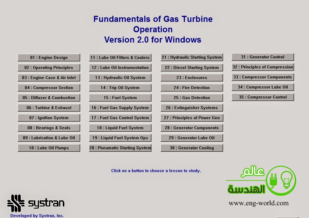 هذا برنامج متكامل يقوم بشرح عمل التربينه الغازيه نظريا وعمليا ومن البدايه ويعتبر من أخطر البرامج التعليميه فى هذا المجال Fundamental of Gas Turbine Operation