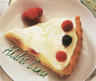 4- نضع نصف الكاسترد في المعجنات ثم نرص الفاكهة مع ترك قليل من التوت للتزيين ثم نفرد عليها باقي الكاسترد.