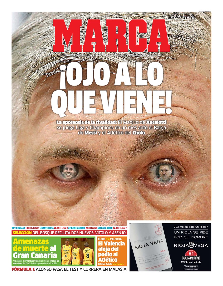 قامت صحيفة الماركا الاسبانية صباح هذا اليوم الاثنين بنشر غلاف صحيفتها اليومية الالكترونية حيث كان الغلاف مخصص لمباراة الكلاسيكو التي خسرها ريال مدريد بهدفين لهدف وحيد بالكامب نو , الصحيفة اطلقت عنوان عريض على الغلاف كانت تقول فيه " الفرض الضائعة " لكمية الفرص التي ضاعت في المباراة من كلا الطرفين .