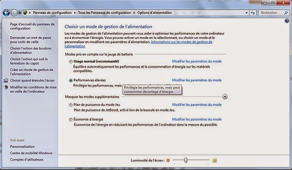 يقوم هذا التغيير بالتعديل على إعدادات الطاقة لتقديم اقوي أداء للحاسوب و بالتالي تسريع الألعاب لتغيير هذا النمط نذهب إلى Panneau de configuration ثم Options d’alimentation ثم تعيين نمط Performances élevées