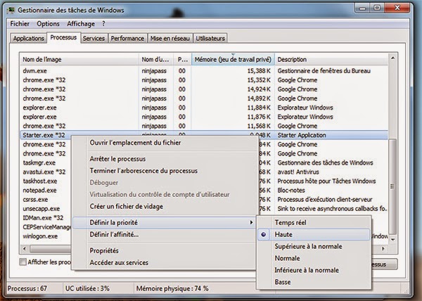 أولا لإعطاء الأولوية لأي لعبة نقوم بفتح اللعبة ثم نفتح Task Manager أو Gestionnaire des taches عن طريق Ctrl+Alt+Suppr ثم نختار التبويب processus ثم نذهب لاسم اللعبة و نضغط بزر الفأرة الأيمن ثم Définir la priorité ثم نختار Haute.