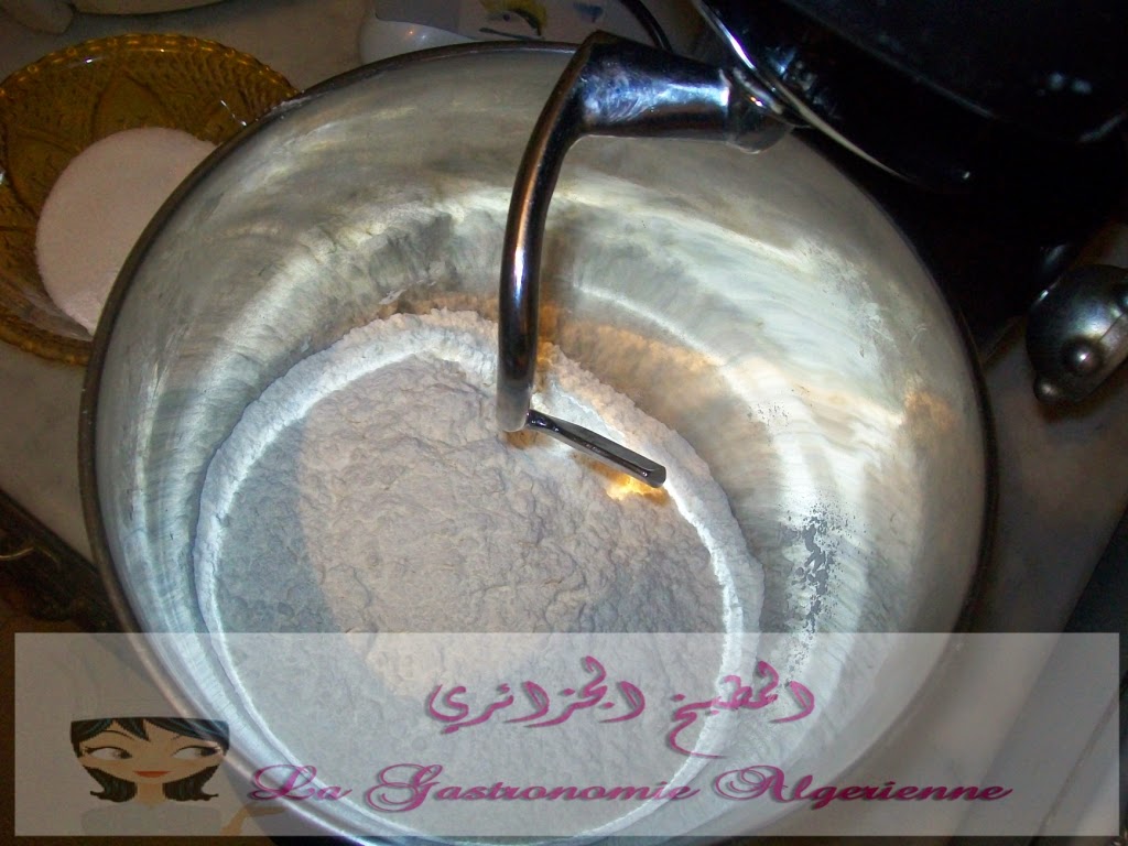 750 غ فرينة +60 غ سكر +14 غ خميرة خبز + 14 غ ملح + ملعقة خميرة حلويات و نخلط جيدا