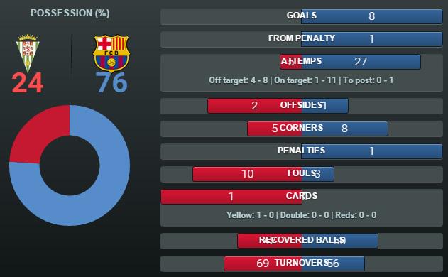 نتهت مباراة برشلونة أمام قرطبة بنتيجة كاسحة للفريق الكاتلوني الذي استطاع أن يواصل سلسلة انتصاراته في الليغا ويقترب أكثر من اللقب .وكان برشلونة قد حاول السيطرة على مجريات اللعب منذ البداية آملا في افتتاح التسجيل مبكرا والقضاء على حماس لاعبي قرطبة ولكنه عانى بعض الشيء في الوصول لمبتغاه حتى نجح في آخر دقائق الشوط الأول في أن يسجل هدفين وفي الشوط الثاني سجل ستة اهداف .وتفوق برشلونة في احصائيات المباراة باكتساح من حيث السيطرة على الكرة والاستحواذ والفرص .واليكم الاحصائيات :