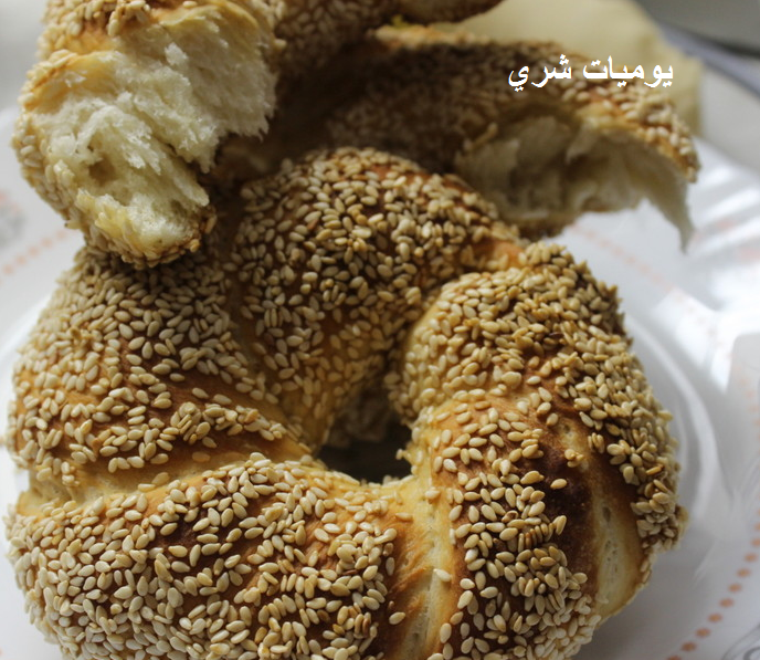 بعد التحمير تعجن قليلا ثم تشكل علي هيئه اسطوانه وتقطع الي 6 قطع تشكل كل قطعه علي شكل كره ثم ناخذ اول كره وتشكل اسطوانه ثم نقوم بتشكلها علي شكل حبل طوله حوالي 50 سم ثم نضم الطرفين علي بعض ثم نقوم بلف او برمها ونغلق طرفين علي بعض بحيث تشكل حلقه وهكذا حتي تنتهي كميه الكور كلها ثم ناخذ اول واحده ونضعها في خليط الماء والعسل وتلف حوالي 4 مرات ثم ترفع وتوضع في طبق السمسم وتغطي تماما وترص علي صينيه مفروشه بورق الخبز وهكذا حتي تنتهي الكميه تماما تغطي بمناشف مطبخ وتترك لتخمر لمده 1ساعه ثم توضع في الفرن علي حرارة 220 درجه حتي تاخذ الون الذهبي البني من تحت وتاخذ الون الذهبي من فوق ترفع من الفرن وتترك لتبرد تماما ثم توضع في وعاء محكم الغلق او كيس بلاستيك