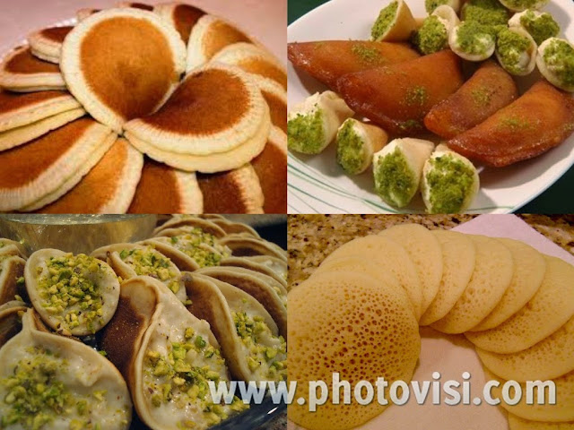 ٤. يصب من الخليط مقدار فنجان قهوة في المقلاة وتقلى من جهة واحدة لنحصل على رقاقة القطايف لونها اشقر من جهة وأبيض من جهة اخرى.