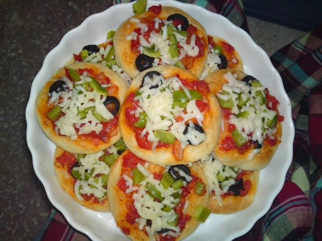 اخبزي البيتزا 10 – 12 دقيقة الى ان تكون ذهبية اللون و يتحمر الجبن. قدميها مباشرة او دافئة