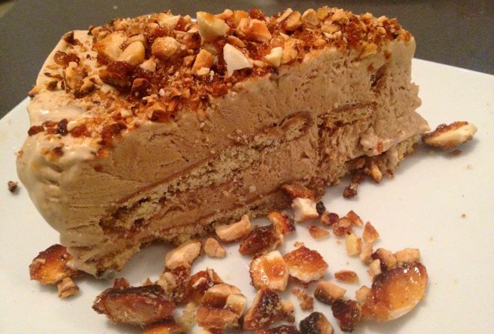 - ضعي الصينية في الثلاجة ، و كسري اللوز مع السكر وزيني بهم كيكة النسكافية الباردة .