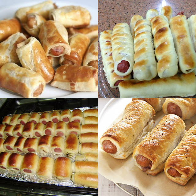 ٢. نقسم العجينة الى 20 كرة، نفرد كل كره بشكل شريط بالطول ونضع قطعه واحده من النقانق ونلف شريط العجينه على كل قطعه بشكل حلزوني بعدما نكمل نضعهم في صينيه مدهونه ونمسح وجه كل قطعه بالبيض وندخلها الفرن حتى تنضج وتتحمر من فوق.
