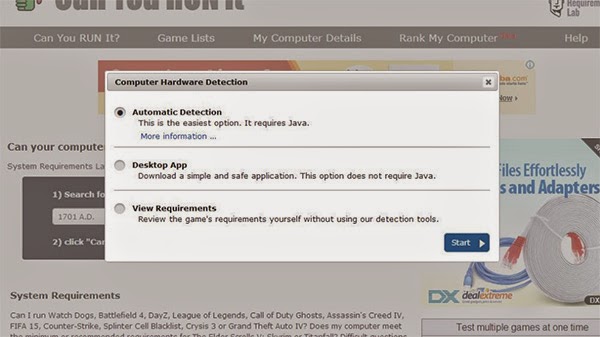 3- ستظهر لكم هذه الواجهة والتي تقول ان الموقع سيقوم بعمل بحث في مكونات حاسوبك ويقارنها مع متطلبات اللعبة. لاختيار الاول سيتطلب منك تثبيت "الجافا" ويمكنك تحميلها من الرابط الذي يزودك به الموقع (وهي الطريقة الأفضل) ، أو تقوم بتحميل تطبيق الموقع .