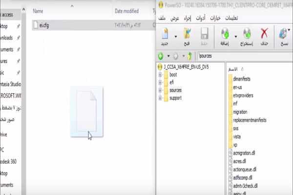 اليوم سنتخلص من كل هته المشاكل و سنقوم بتثبيت الويندوز 10 بدون الحاجة الى ادخال كود التثبيت ، فقط كل ما عليك هو أن تتوفر على برنامج PowerISO و ملف الايزو الخاص بالويندوز 10 بطبيعة الحال ، و بعد توفر كل هذا تقوم بتحميل هذا الملف 'Remove Serial' و تتركه جانبا .. الأن تقوم بفتح ملف الايزو الخاص بالويندوز 10 عن طريق برنامج PowerIso ثم تفتح الملف الذي هو تحت اسم 'Sources' ثم تفتح الملف الذي قمت بتحميله سابقا (Remove Serial) ستجد بداخله ملف باسم 'ei.cfg' تقوم بسحبه الى المسار الذي سبق و قنا بفتحه.
