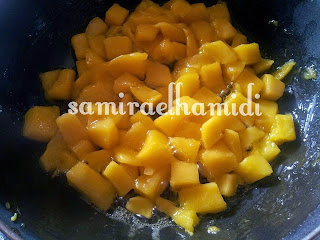 نذيب السكر في مقلاة الى ان يذوب تماما ويتحول لكراميل تم نضيف قطع المانغ مع التحريك بمهل لكي ليتعجن المانغ ويمتزج الكراميل مع المانغ