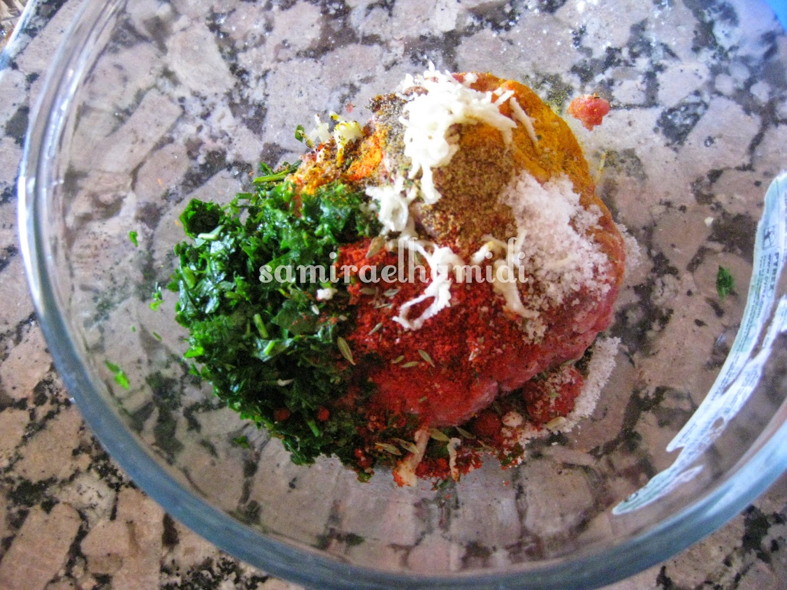 • رابعة كفتة متبلة ( ملح وابزار وخرقوم بلدي و زنجبيل وزعترو ثومة محكوكة و كمون وملعقتان كبيرتان معدنوس وقزبور)