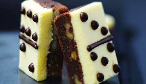 5-قطعيه على شكل قطع الدومينو ثم زينيه بخطوط ونقاط من الشكولاطة السوداء