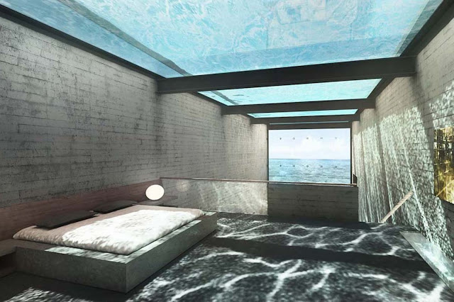 الزجاج على السقف و الجدران يوفر أيضا طريقة عرض كاملة على طول البحر والسماء، بينما من الداخل، استخدام الإسمنت يجعل المنزل صلباُ للغاية ما يوفر جوا رائعاً للعائلة.